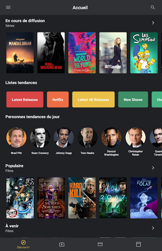 • Explorez un grand nombre de catégories pour trouver de nouveaux films, séries et personnes : populaire, à venir, au cinéma, tendances, les mieux notées ; séries diffusées aujourd'hui ; séries diffusées cette semaine et bien plus