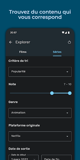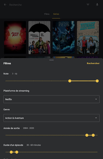 • Recherchez des films et des séries télévisées en fonction de divers critères (nom, genre, note, réseau de diffusion en continu, date de sortie, durée de l'épisode, durée du film, etc.) et triez les résultats comme vous le souhaitez