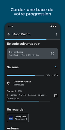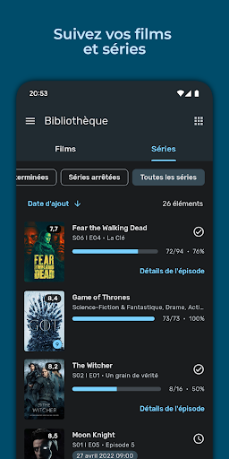 • Marquez les films, séries, saisons et épisodes comme regardés et accédez à votre historique complet