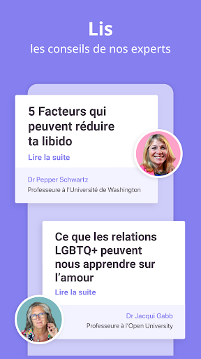 Enfin, nos exercices ont été créés par les meilleurs chercheurs et conseillers conjugaux au monde et s’appuient sur les théories d’experts mondialement connus, comme John Gottman ou Sue Johnson, pour t’aider à en apprendre davantage sur les relations. Chaque exercice inclut un sujet de discussion sous forme de question-réponse à compléter à deux.