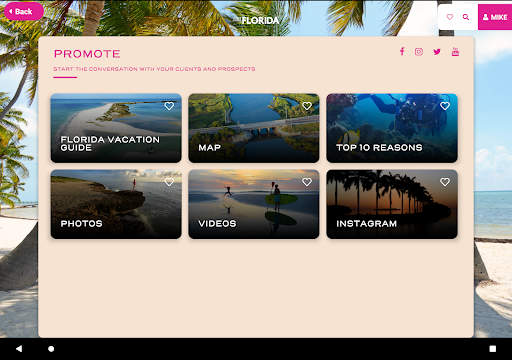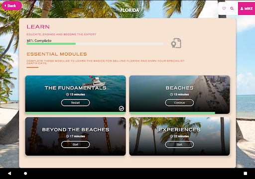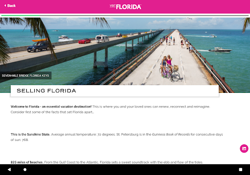 Au nom de la visite de Floride, bienvenue dans le programme de formation de la Visite de Floride et Compagnon de vente.Cette application mobile est conçue pour vous aider à découvrir et à vendre de Florida comme un pro, à tout moment ou à n'importe où - aider à maintenir votre expertise longtemps après avoir terminé le cours de formation Florida intégré de la visite.