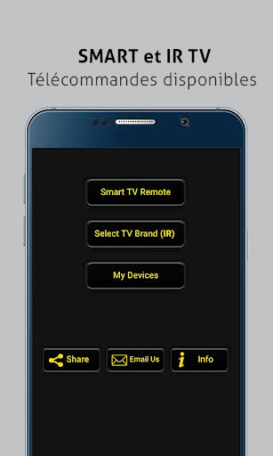 Si votre marque ne figure pas dans la liste ou si l'application de télécommande du téléviseur ne fonctionne pas avec votre téléviseur, envoyez-nous un email avec votre marque de télévision et votre modèle de télécommande. Nous allons travailler pour rendre cette application compatible avec la marque de votre téléviseur.