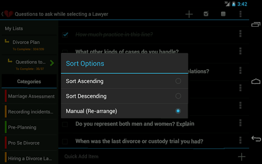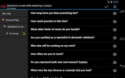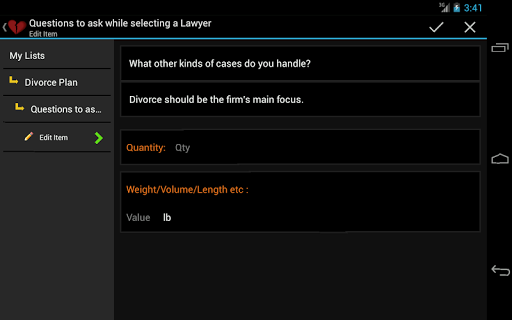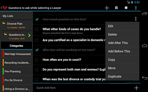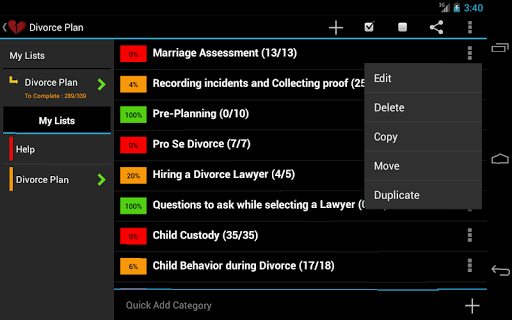 Passer par un divorce peut être difficile. Les lois de divorce sont compliquées. Il y a beaucoup de choses que vous devez planifier. Cette application de divorce planificateur vient pré-peuplée avec plus de 350 tâches et traverse toutes les étapes, notamment l'évaluation du mariage, les incidents d'enregistrement, la preuve de collecte, l'avocat d'embauche, la garde des enfants, les dossiers financiers, les négociations, l'audience d'essai, etc. Il vous guide également à travers Étapes pour reconstruire votre vie après un divorce. Évitez les erreurs coûteuses. Soyez planifié et préparé.