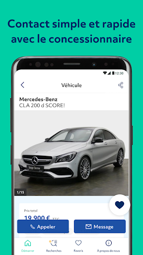 - Lorsque vous avez trouvé un véhicule qui vous intéresse, vous pouvez contacter directement le concessionnaire par téléphone ou faire une demande de mise en relation via l’application. Le concessionnaire reviendra vers vous sur votre propre adresse électronique et organisera un rendez-vous sur place. Sur une sélection de véhicules, vous pouvez également choisir l’achat en ligne avec livraison à domicile ou la réservation en ligne, l’essai et l’achat en concession.