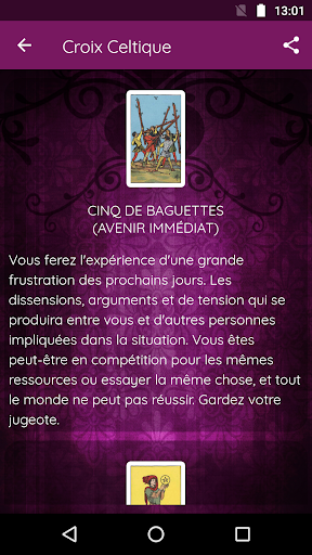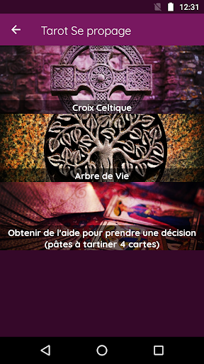 Avez-vous beaucoup de questions qui ont besoin d'une solution? Ne vous inquiétez pas! Obtenez une réponse instantanée à toutes vos questions avec l'aide de Tarot spreads-la vie libre et l'amour lectures quotidiennes. Cette application caractéristiques croix celtique, l'arbre de vie, les clés de la vie, le potentiel relationnel, le but de la relation, l'amour et la relation Tarot, des réponses instantanées à vos questions sur votre esprit sur l'argent, la vie, la santé, la famille, et l'amitié.