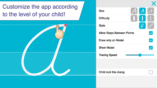 • बच्चे के वर्तमान शिक्षा स्तर (पत्र का आकार, कठिनाई, दिखाने/छिपाने के मॉडल के अनुसार ऐप को अनुकूलित करने के लिए कई पैरामीटर, प्रमुख बिंदुओं, आदि के बीच रुकने की अनुमति दें)