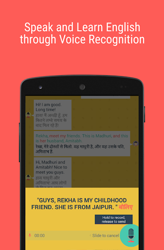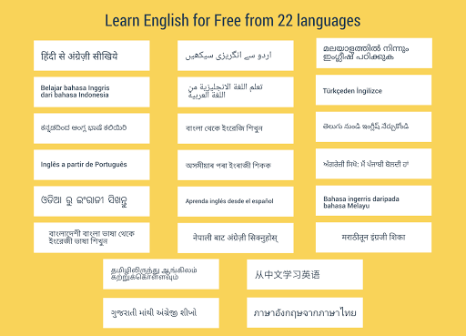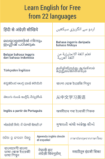CultureAlley की Hello English App के साथ spoken English सीखें - यह कोर्स विशेष रूप से हिंदी, मराठी, बंगाली ( बांग्लादेश), आसामी, नेपाली, बंगाली (भारतीय), तमिल, तेलुगु, पंजाबी, उर्दू, मलयालम, कन्नड़, ओड़िया, इंडोनेशियन, थाई, अरेबिक, मलय, चाइनीज़, पुर्तगाली, तुर्की, नेपाली और गुजराती बोलने वालों के लिए बनाया गया है. यह English learning app दुनिया भर में 5 करोड़ से भी अधिक लोगों का विश्वास जीत चुकी है. यह app, आपको अंग्रेजी पढ़ने, लिखने, बोलने, सुनने, और अपनी English vocabulary का निर्माण करने में मदद करेगी.