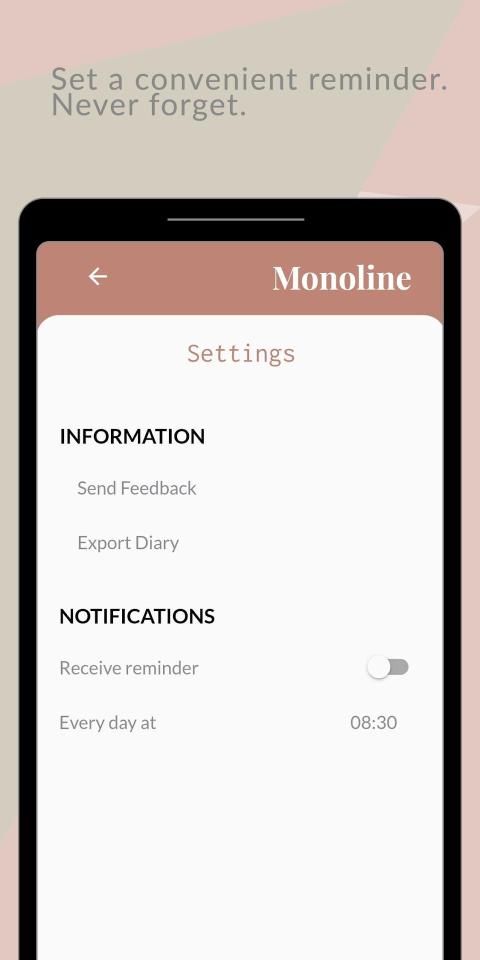 Unlike other diary apps, using Monoline doesn't involve a complicated sign-up process and giving away your personal data. It can be used completely off-line and comes with an import/export function that allows you to save and restore a copy of your diary at any time you want.