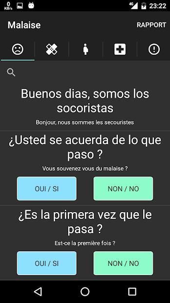 Les questions sont classées par thème : malaise/ trauma/ grossesse/médecin/informations.