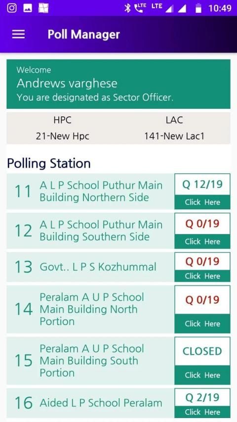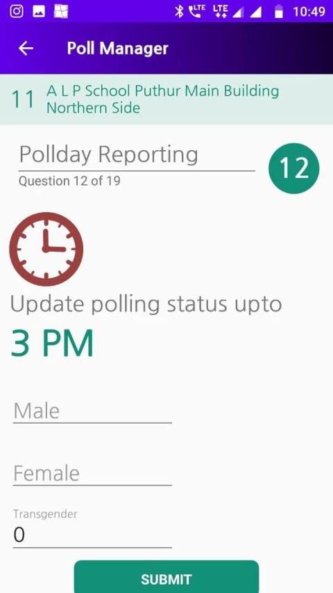 The application is used by the officials authorised by the Chief Electoral Officer, Kerala. The mobile application developed by National Informatics Centre is intended to facilitate officers at higher level to have an overall status of all officers working under them and to ensure effective communication, minimum assured facilities Monitoring, repository of information, complaint registration and redressal, FAQs and Poll Day status monitoring.