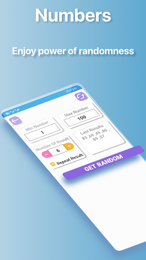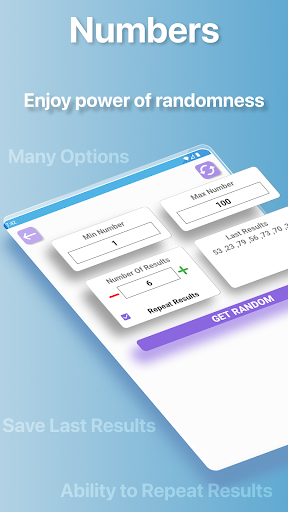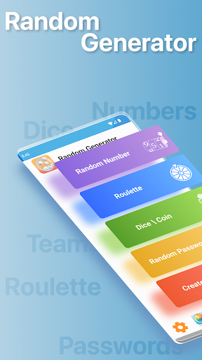 रैंडम जेनरेटर रैंडम नंबर, रूले, डाइस, कॉइन, रैंडम पासवर्ड जेनरेट करने और रैंडम टीम बनाने और ड्रा करने के लिए एक सरल और आसान ऐप है।