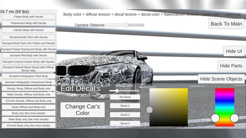 कुछ दृश्यों में कार के रंग को बदलने और decals जोड़ने के लिए एक रंग पिकर है।