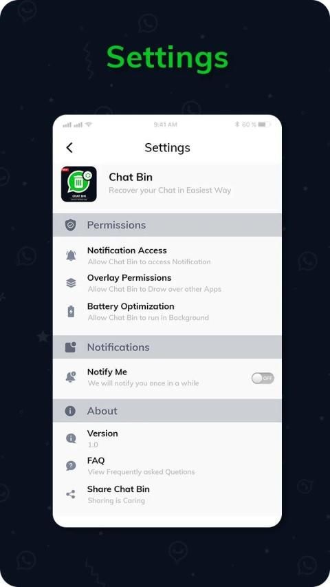 Recover Deleted Chat on Whatsapp App needs special permission to do whatsapp deleted messages recovery. Every WhatsApp's removed message or any stay inside your phone's database. We save your message in your phone's internal storage inside our database and restore from there. Recover Deleted Chats And deleted photos in phone's storage inside a folder. To disable the permission just search for notification access in the settings and uncheck the Recover Deleted App.