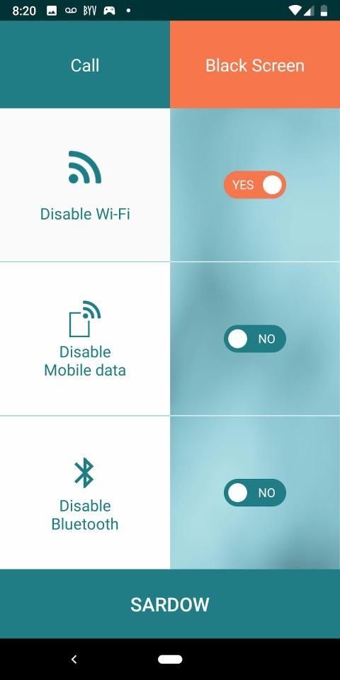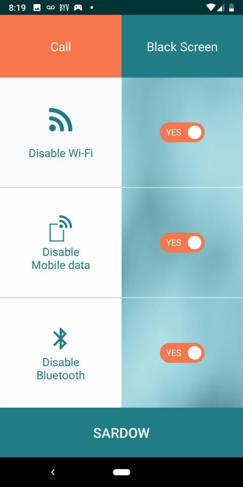 Once SARDOW is downloaded on the phone, the user has a choice to select settings to automatically turn off Wifi signal, Mobile Data and Bluetooth during a call, or when a phone is in black screen mode. It is a user’s choice to either turn off any or all of the three settings. Once a call starts, Wifi, and/or mobile data, and/or Bluetooth are off for the duration of the call. Once a call ends, WiFi, Mobile Data and Bluetooth turns back on automatically.