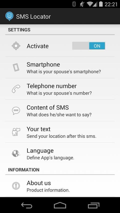 एंड्रॉयड फोन के लिए एसएमएस लोकेटर एप्लिकेशन को तेजी से और आसानी से अपने पति का पता लगाने में आता है. एक एसएमएस भेज कर, आप स्वत: अपने पति शहर में स्थिति और तुम वहाँ पाने के लिए जरूरत के बारे में जानकारी प्राप्त करेंगे.
