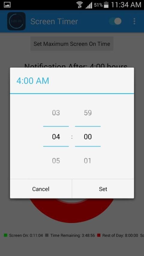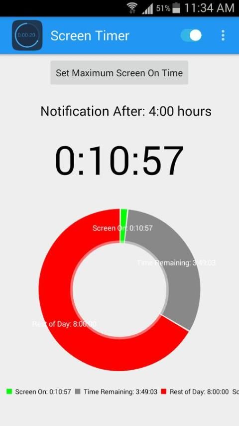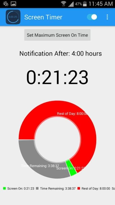 इस एप्लिकेशन को आप प्रत्येक दिन अपने फोन का उपयोग किया है समय की राशि की गणना करेगा, और उपयोग की एक निश्चित राशि के बाद आप एक चेतावनी दे देंगे (टाइमर अपनी आवश्यकताओं के अनुसार के रूप में आप द्वारा निर्धारित किया जा सकता है)।