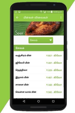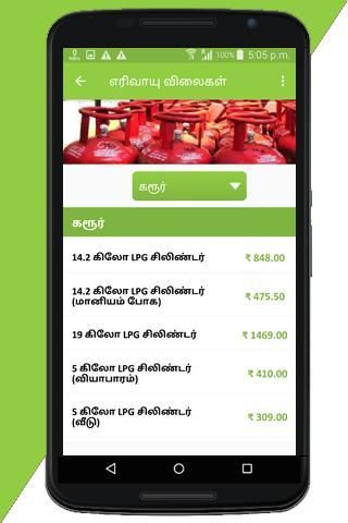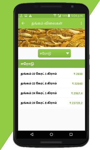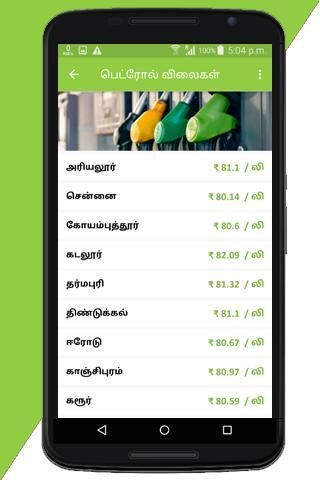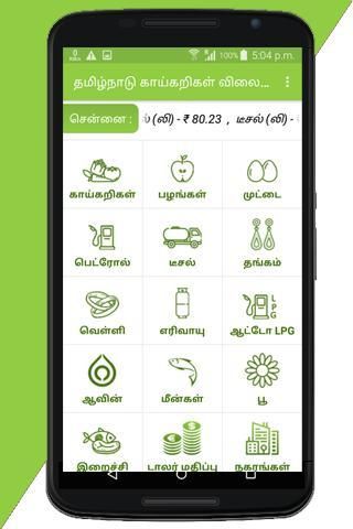 तमिलनाडु दैनिक बाजार मूल्य ऐप सब्जियां, फल, अंडे, पेट्रोल, डीजल, सोना, चांदी, एलपीजी गैस, ऑटो एलपीजी, मछली, फूल, मांस जैसी दैनिक बाजार मूल्यों के बारे में प्रदान करता है।