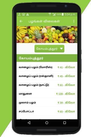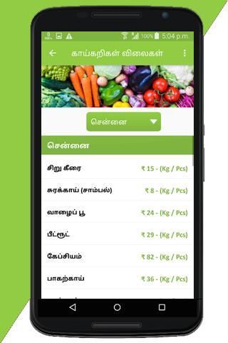 Tamilnadu Daily Market Prices app provide about the Daily Market Prices like Vegetables, Fruits, Egg, Petrol, Diesel, Gold, Silver, LPG Gas, Auto LPG, Fish, Flowers, Meat.