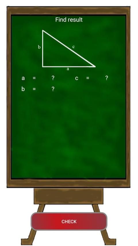 2. "उदाहरण" - आवेदन चयन करने के बाद पाइथागोरस प्रमेय एक यादृच्छिक उदाहरण पैदा करते हैं और उपयोगकर्ता परिणाम की गणना करना चाहिए।