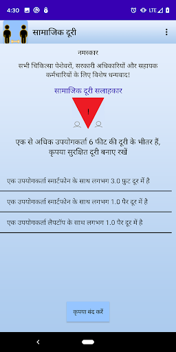 3. लाल चिह्न: यह संकेत तब प्रदर्शित होता है जब ऐप 6 फीट की दूरी के भीतर एक से अधिक उपयोगकर्ताओं का पता लगाता है। एक संदेश जो "एक से अधिक उपयोगकर्ता 6 फीट की दूरी के भीतर है, कृपया एक सुरक्षित दूरी बनाए रखें" प्रदर्शित किया जाएगा।