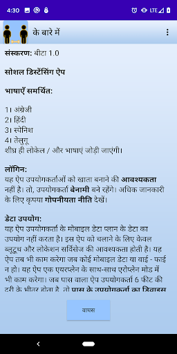 डेटा का उपयोग: यह ऐप उपयोगकर्ता के मोबाइल डेटा प्लान के डेटा का उपयोग नहीं करता है। इस ऐप को चलाने के लिए केवल ब्लूटूथ और लोकेशन सर्विसेज की आवश्यकता होती है। यह App तब भी काम करेगा जब कोई Mobile Data या Wifi न हो। यह ऐप एक एयरप्लेन के साथ-साथ एयरप्लेन मोड में भी काम करेगा।
