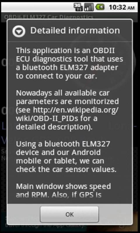 इस आवेदन को अपनी कार से कनेक्ट करने के लिए एक ब्लूटूथ ELM327 एडाप्टर का उपयोग करता है कि एक OBDII के ईसीयू निदान उपकरण है.