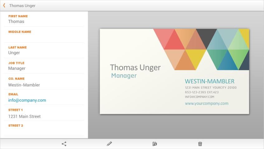 • Intelligent text recognition reads printed text and extracts key information, such as names and addresses from business cards, tax and totals from receipts.