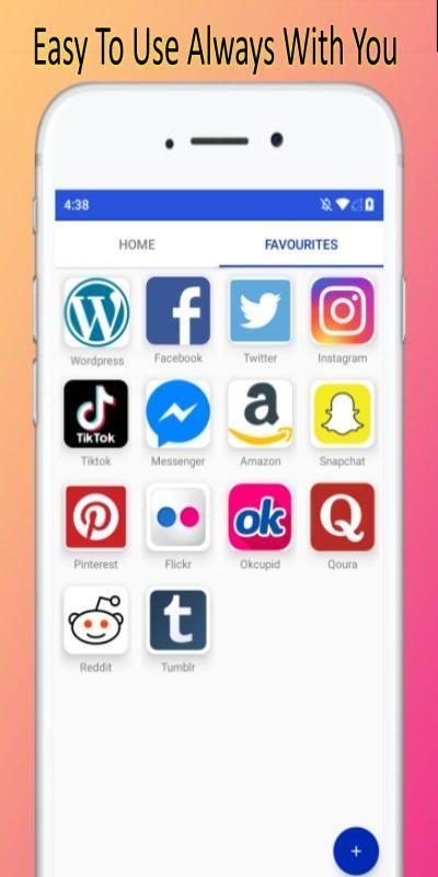 You can maintain favorite list of social media category add all social network app like Facebook, Twitter, Instagram, Snapchat , Reddit, Dailymotion, Badoo,Buzzfeed, Alibaba, StumbleUpon, Netflix, PhotoBucket, Vimeo, WixBlogger, Adsense, Admob, Quora at one social media app.