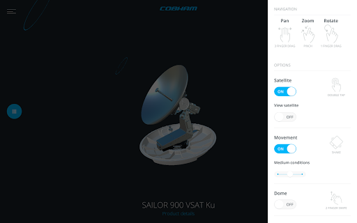 में अविश्वसनीय विस्तार के साथ विभिन्न कोबहम Satcom उत्पादों को देखें • एक साधारण ट्रैकर छवि का उपयोग कर किसी भी पर्यावरण में उत्पादों को रखें