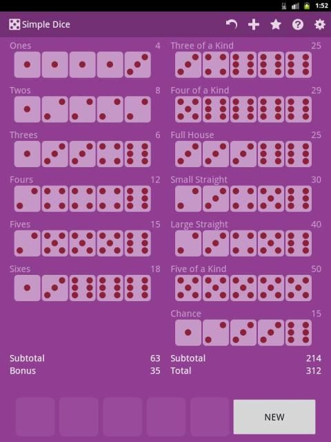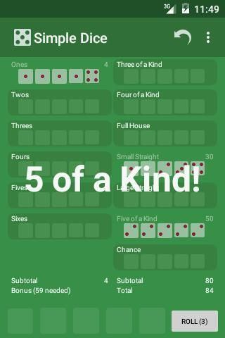 Roll the dice and contemplate your next move. Simple Dice is a game of strategy and chance. Whether you choose to save your roll and earn the allotted points for a three of a kind, or keep trying for a 40 -point large straight, this will have you crossing your fingers for that lucky roll.