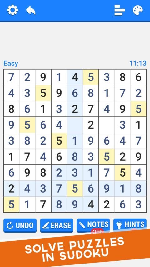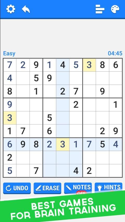 2. आसान पंक्ति और स्तंभ को प्रत्येक पंक्ति, स्तंभ और वर्तमान वर्ग के भीतर समान संख्याओं को दोहराए बिना 1-9 संख्याओं से भरा होना चाहिए।