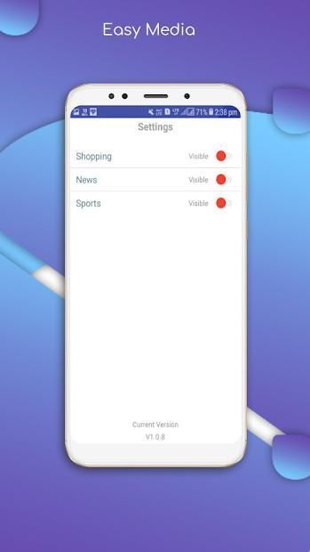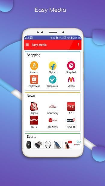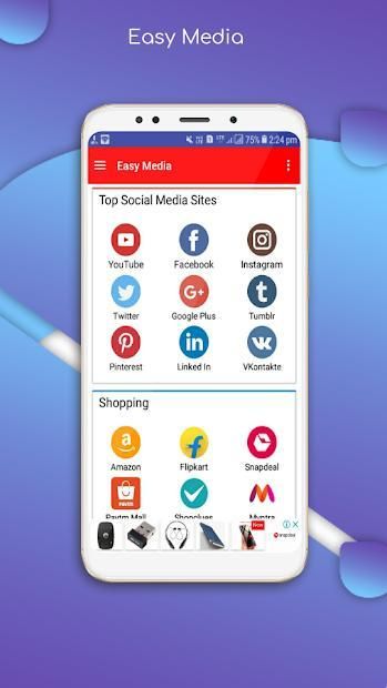Easy Media is an application that provide an easy access to all social networks, Shopping, News & Sports sites namely: Youtube, Facebook, Twitter, Instagram, Google +, Pinterest , Amazon, Flipkart, Aaj Tak, NDTV, News18, Crickbuzz & many others