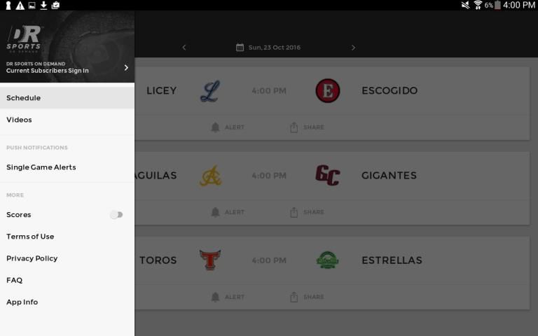 DR Olahraga adalah sebuah aplikasi di mana pengguna dapat menonton semua pertandingan dari Profesional Baseball League Republik Dominika (lidom), hidup dan atas dasar permintaan.
