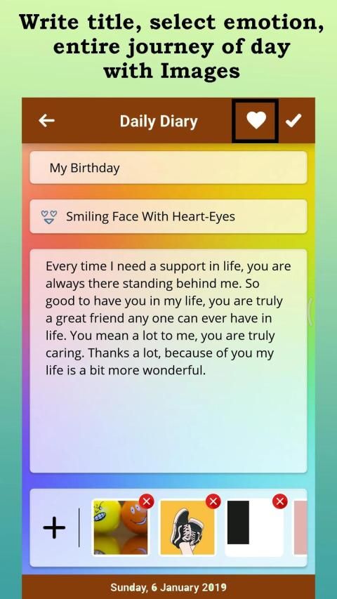• SAFEGUARD MEMORIES: Daily Diary enables to write a private diary, memoir, journals and notes with images in the easiest way. Thus helps to record memories in an organized manner.