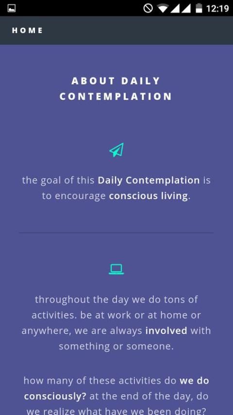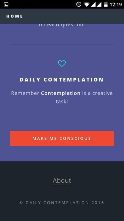 Koleksi pertanyaan memprovokasi pemikiran yang bertujuan untuk meningkatkan tingkat kesadaran Anda. Gunakan aplikasi ini setiap hari menjelang akhir setiap hari untuk mencapai keadaan kontemplatif pikiran Anda.