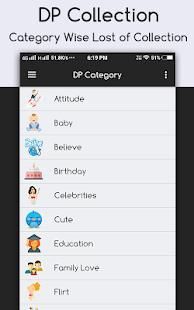 - Attitude DP,Baby DP, Believe DP,Birthday DP,Celebrities DP,Cute DP,Education DP,Family Love DP,Flirt DP,Friend DP, Funny DP,Good Morning DP, Good Night DP,Love DP,Miss You DP,Romantic DP,Sad DP,Saying DP,Success DP,Weather DP.