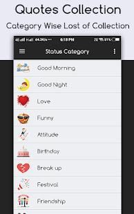- Good Morning Status,Good Night Status,Love Status,Funny Status,Attitude Status,Birthday Status,Break up Status,Festival Status,Friendship Status,Group Status,Indian Status,Inspiring Status, New Year Status,Romatic Status,Sad Status.