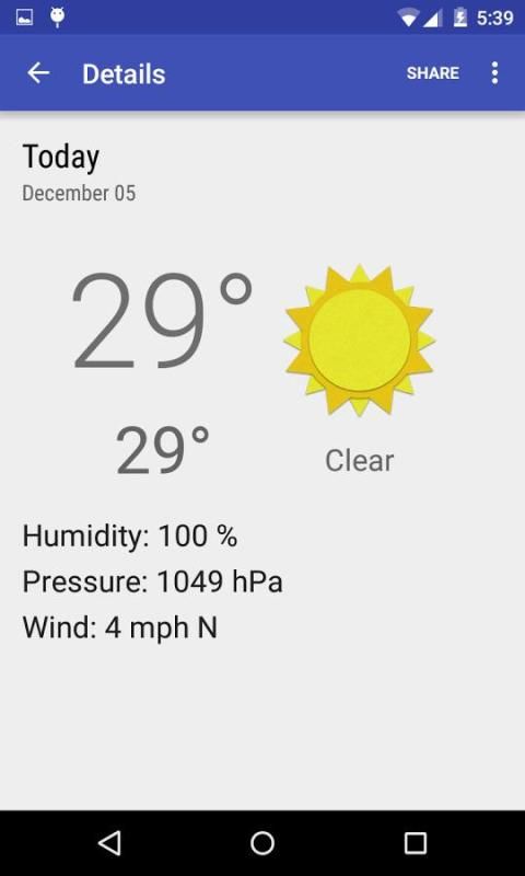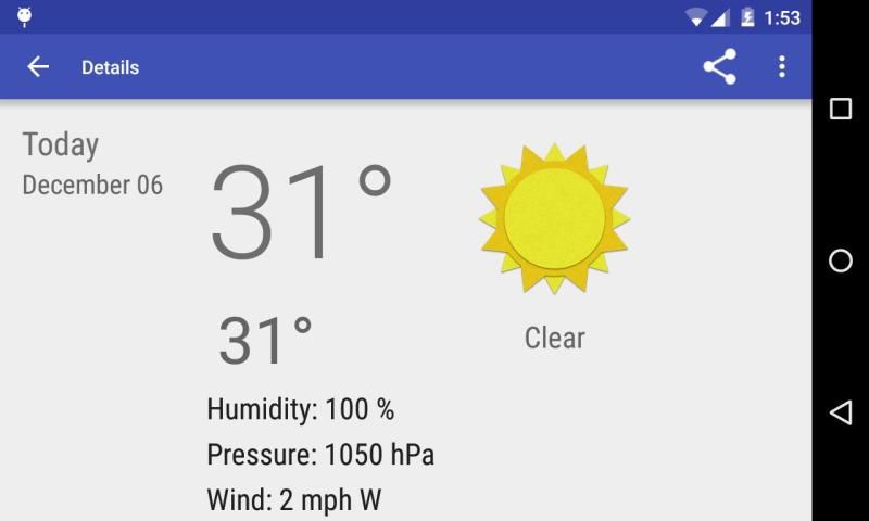 Details include High and low temperatures, humidity, Pressure and Wind speed.
