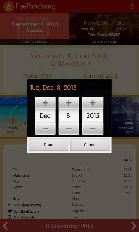 Gratis Panchang App ini dirancang khusus untuk Android Mobile Phones dan Tablet untuk mendapatkan semua yang diperlukan Panchang terkait informasi secara gratis. Dengan penciptaan App ini, Panchang adalah di saku Anda sekarang. Ciri utama Panchang ini akurasinya diuji. Gratis Panchang App dapat memberikan Panchang untuk setiap hari dan setiap tempat dengan akurasi kedua untuk 200 tahun yaitu 1900-2100.