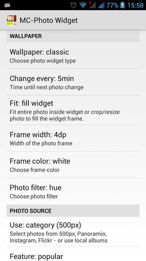 2) klik Panjang pada layar rumah -> Widget -> MC-Foto Widget AxB -> Configure Pilihan