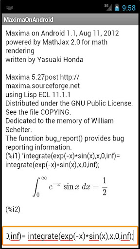 Maxima, a full featured computer algebra system, now runs on your Android mobile devices. Maxima, and its predecessor Macsyma is one of the most long-established software in the world, back in 1960s at MIT LCS and Project Mac. You can perform many many math operations such as integration, differentiation, matrix operations, rational numbers, symbolic treatment of constants such as pi, e, euler's gamma, symbolic and numerical treatment of special functions such as sin(x), cos(x), log(x), exp(x), zeta(s), and many more.