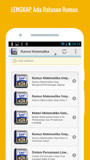 Spesial buat sobat yang duduk di bangku Sekolah Menengah Pertama (SMP), dalam rangka membantu kalian belajar matematika, kami sajikan aplikasi Rumus Matematika SMP Lengkap berbasis android. Aplikasi ini sangat komplit mulai dari materi, rumus, contoh soal, dan pembahasan.
