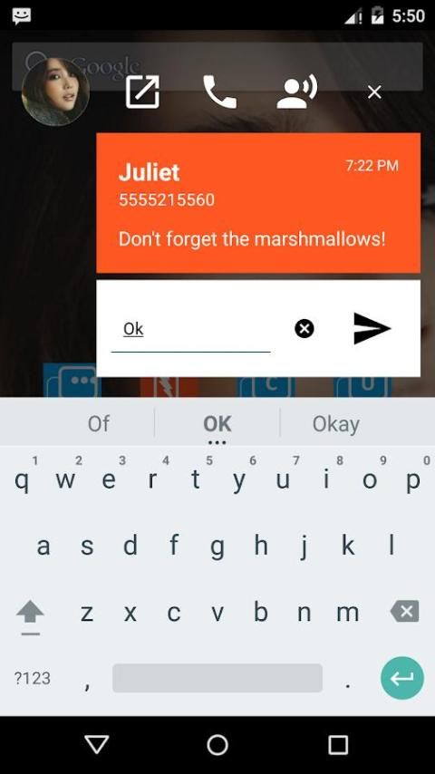 • Popup menunjukkan nama kontak, nomor kontak, waktu, konten sms, gambar kontak