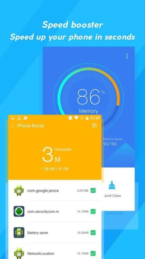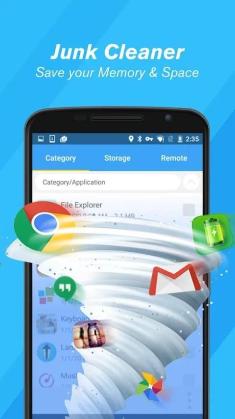 Mendeteksi kesehatan ponsel, Antivirus dan junk file Anda dalam hitungan detik. Memudahkan untuk memperbesar penyimpanan telepon.