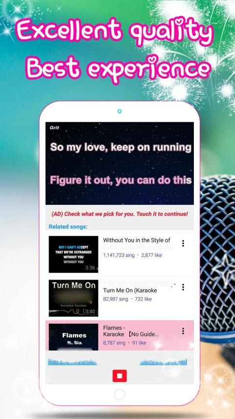 SING KARAOKE FREE 100% on Android with customize features (personalized) into your own application, each person will a presentation according to their own applications. In addition to the powerful search function you can search for any song, artist, musicians, music genre also. It will appear as soon as you hit the search button without having to wait.