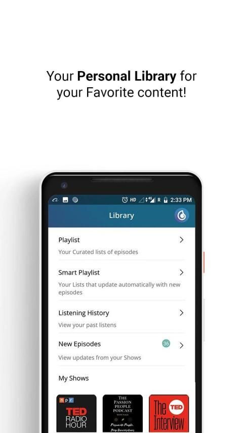 -- Smart Custom Playlists: Our servers keep your playlists updated w/ your favorite podcasts.
