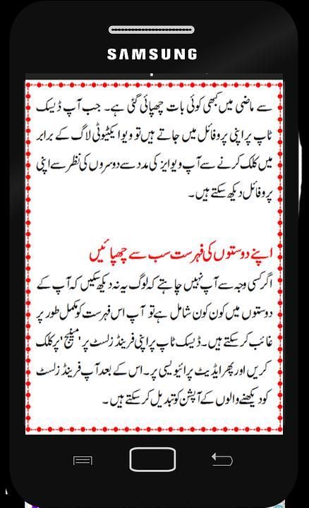 Menggunakan aplikasi kami "Urdu Tips dan Trik Facebook" Anda dapat belajar tentang bagaimana membuat aman id Anda di Facebook dan Bagaimana Anda dapat merasa aman di jaringan media sosial Facebook. Kami telah mengorganisir Facebook Trik dalam aplikasi ini yang memiliki semua panduan bekerja dan berguna dan trik di dalamnya untuk Anda. Trik facebook dan Guides tidak berbahaya bagi pengguna atau pengguna perangkat. Hal ini berguna dan baik dipraktekkan aplikasi untuk Anda. Menggunakan aplikasi ini Anda tidak hanya membuat aman diri sendiri tetapi Anda juga dapat membuat aman Facebook untuk orang lain juga.