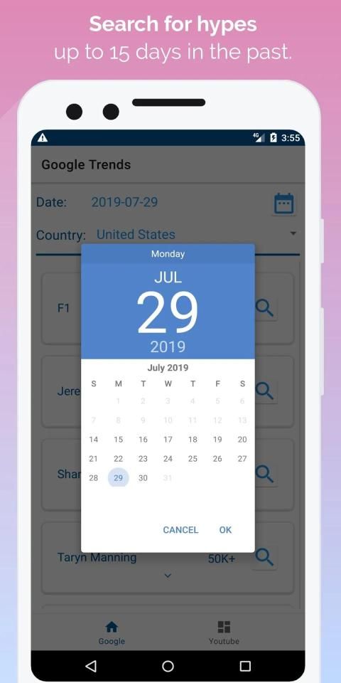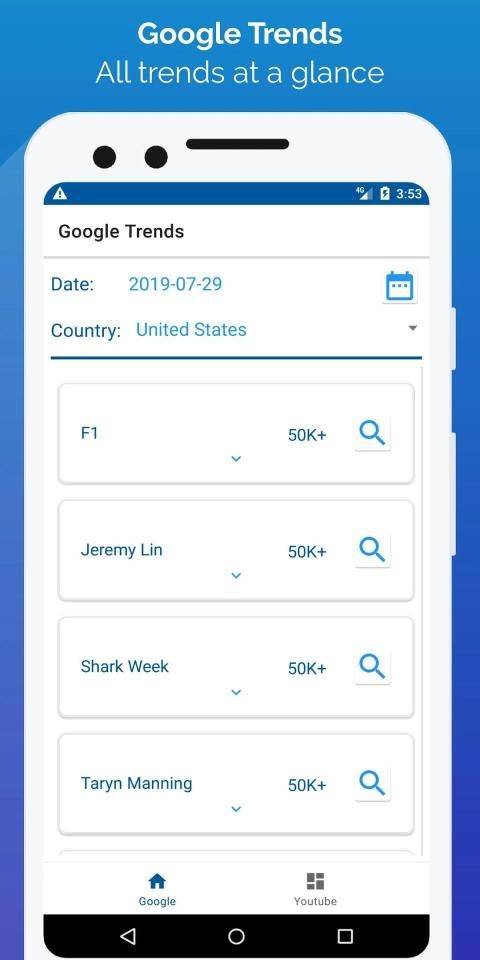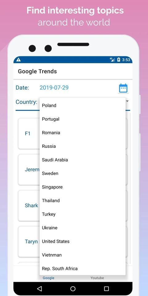 Nowaday it's really difficult to have an overview of all trends. With "Trends Ranking" you see all hypes at a glance. Our app provides you with all daily trends on Google and on Youtube and that sorted by country and date!