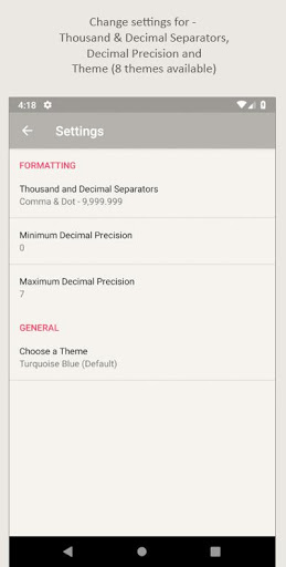 * Ability to customise app for Thousand/Decimal separators, Decimal precision and color theme