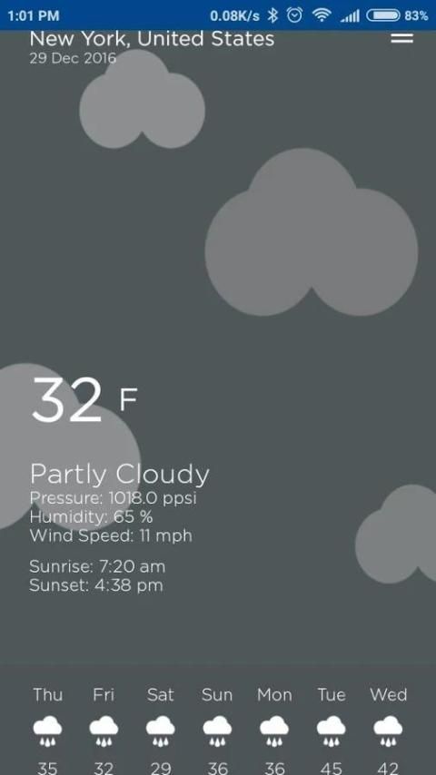 Aplikasi Cuaca sederhana dengan mudah menggunakan antarmuka pengguna. Kami merancang latar belakang kustom untuk setiap kondisi cuaca, bahkan untuk siang dan malam. Desain datar minimal aplikasi ini akan meniup pikiran Anda.
